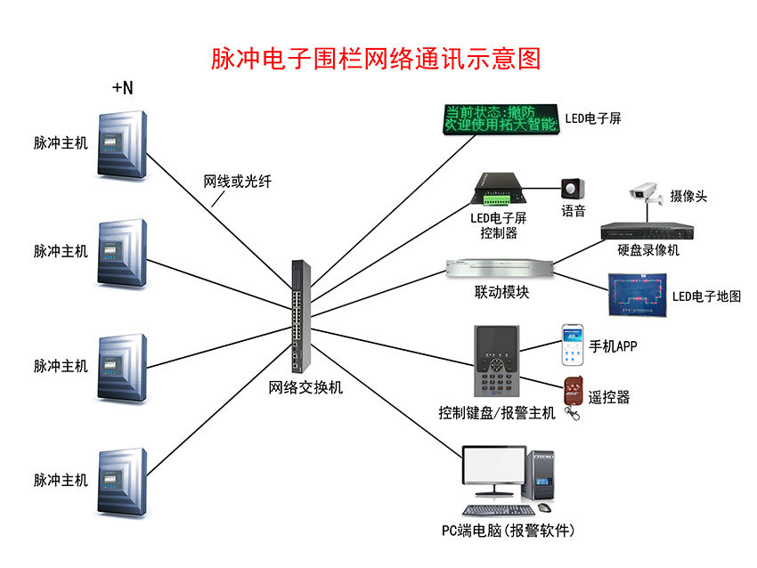 脈沖(chōng)電子圍欄報(bào)警系統示意圖——網絡(luò)通訊+LED電(diàn)子屏+語音