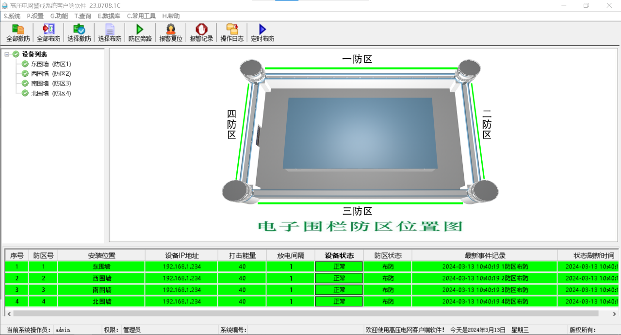 ●  功能 :管理控制前端高壓電網主機、分控主機;實時監控前端電網圍欄防區狀态以及對防區參(cān)數設定;支持報(bào)警信息、軟件操作信息查詢導出